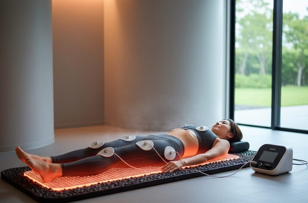 体を芯から温める「岩盤ヒートマット」と、電気で筋肉を刺激する「EMS」を組み合わせた、寝ているだけで完結する効率的なトレーニング方法です。